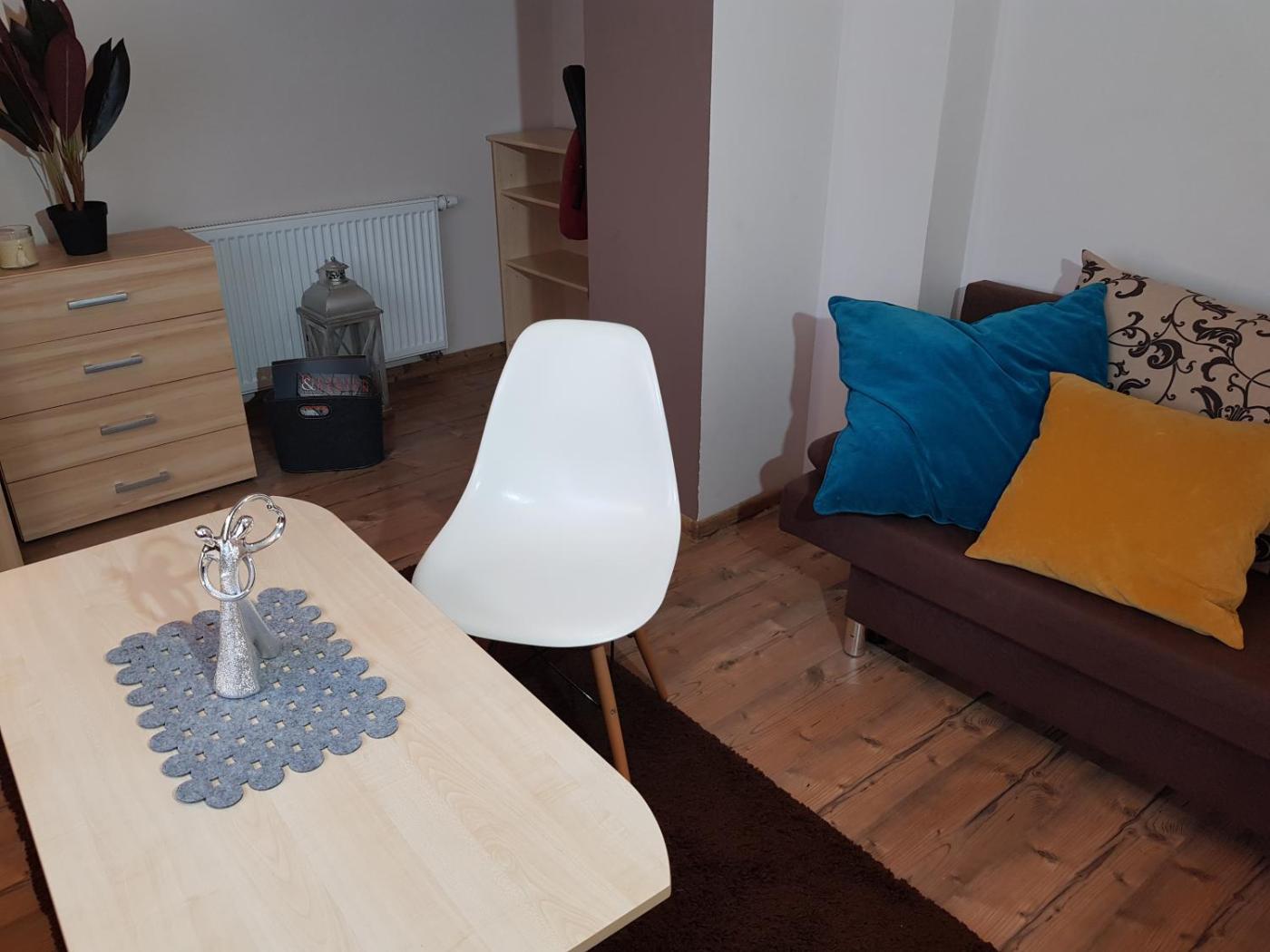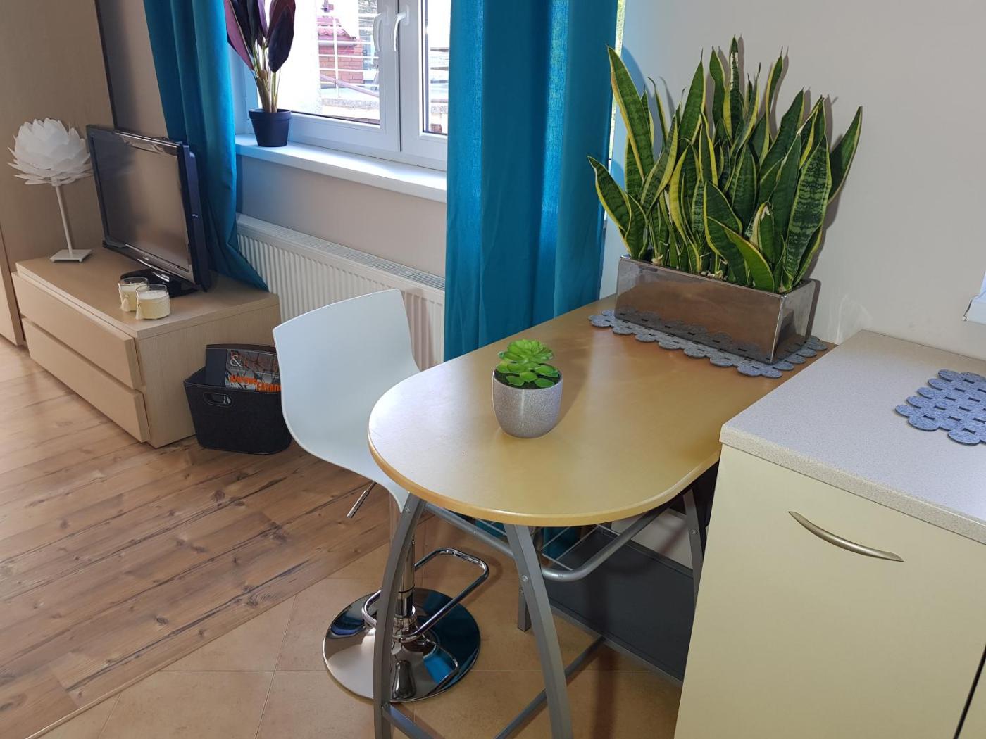 Apartament typu Studio z tarasem. Offering a dining area, a wardrobe and an electric kettle, this studio includes a private bathroom. In the fully equipped kitchen, guests will find a refrigerator, a dishwasher, kitchenware and a microwave. Featuring a terrace with a quiet street view, this studio also offers a private entrance and a flat-screen TV. The unit offers 2 beds. Studio - 4 osobowy. Powierzchnia pokoju ok.: 35 mkw. ;