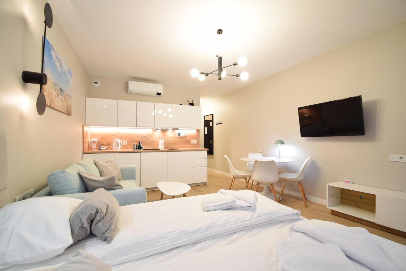 Apartament typu studio z balkonem. Featuring a private entrance, this air-conditioned apartment is comprised of a kitchenette, 1 bedroom and 1 bathroom with a shower and a hairdryer. Guests can make meals in the kitchenette that comes with a stovetop, a refrigerator, a dishwasher and kitchenware. Boasting a balcony, this apartment also offers a washing machine, a tea and coffee maker and a flat-screen TV with streaming services. The unit offers 2 beds. Apartament - 4 osobowy. Powierzchnia pokoju ok.: 30 mkw.
