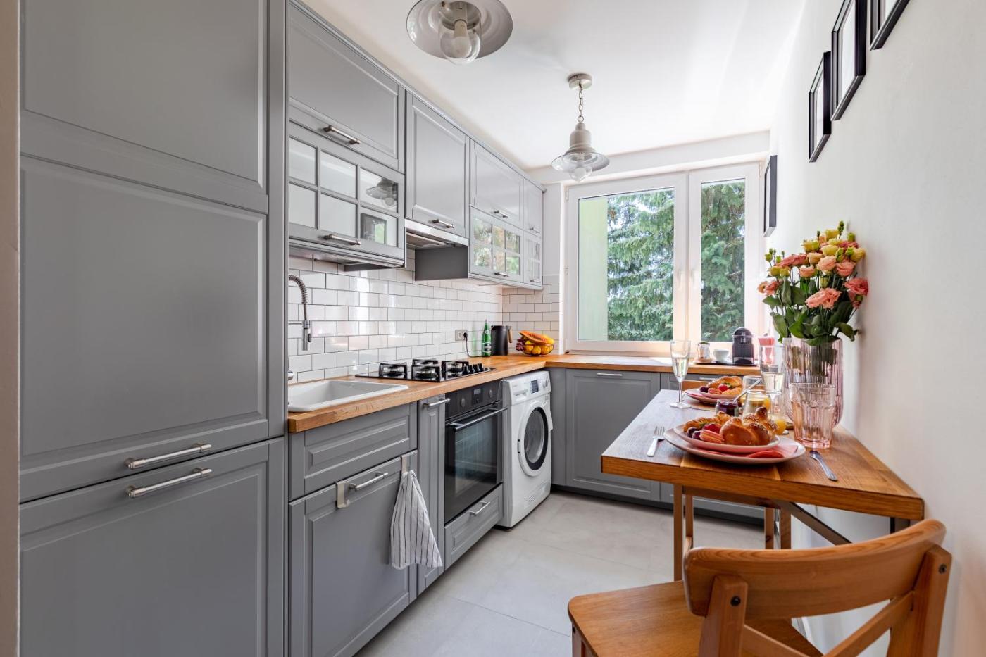Apartament z 1 sypialnią. The apartment features 1 bedroom and 1 bathroom with a walk-in shower and free toiletries. The fully equipped kitchen has a stovetop, a refrigerator, kitchenware and an oven. The apartment provides a flat-screen TV with cable channels, a washing machine, a tea and coffee maker, a dining area as well as garden views. The unit offers 1 bed. Apartament - 2 osobowy. Powierzchnia pokoju ok.: 38 mkw.