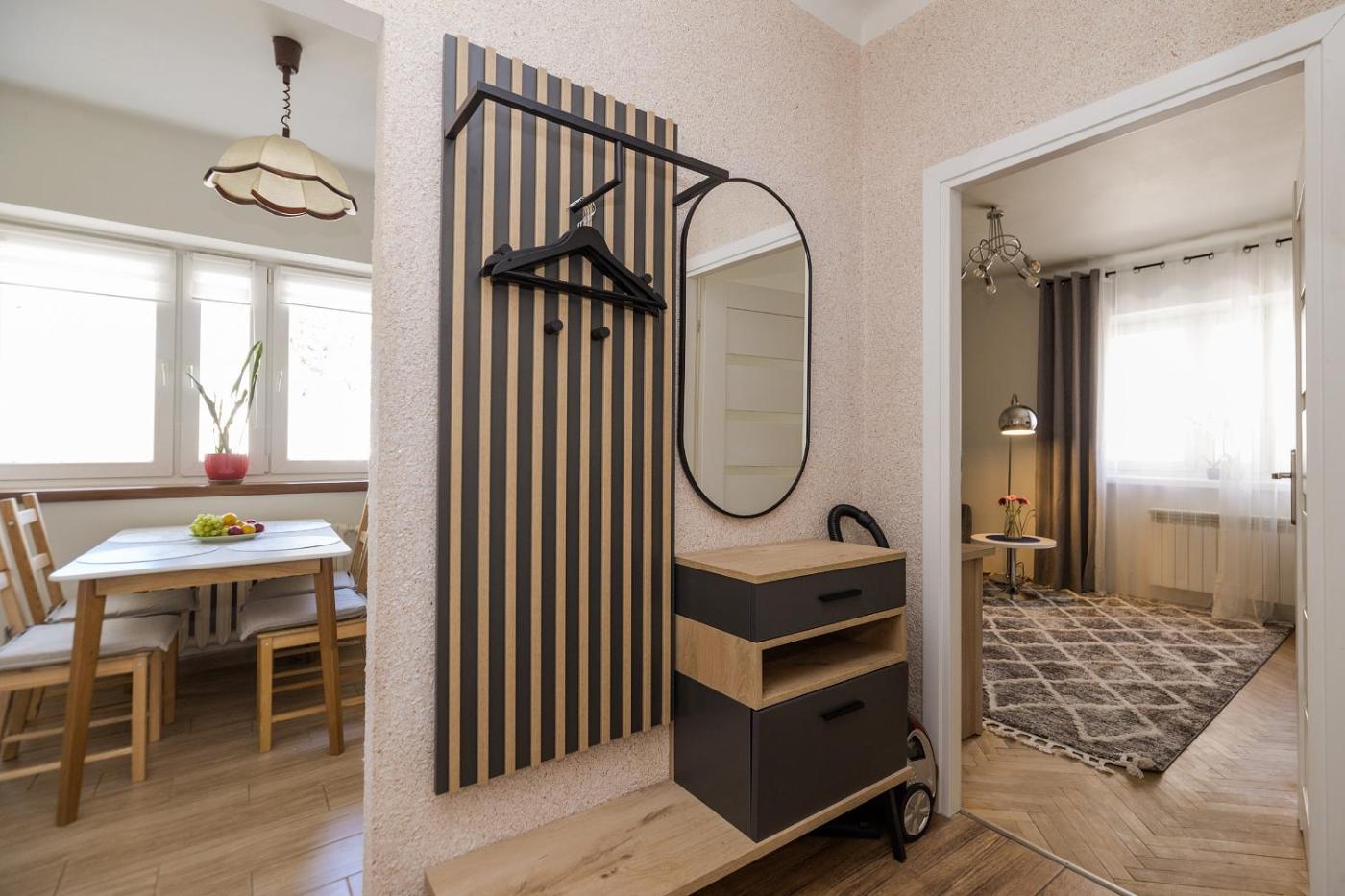 Apartament z 1 sypialnią. This apartment comprises 1 living room, 1 separate bedroom and 1 bathroom with a shower and free toiletries. The fully equipped kitchen features a stovetop, a refrigerator, kitchenware and an oven. The apartment provides a washing machine, a seating area, a dining area, a wardrobe, as well as a flat-screen TV. The unit offers 2 beds. Apartament - 4 osobowy. Powierzchnia pokoju ok.: 41 mkw.